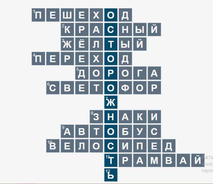 | Заключительная часть | -Молодцы! А теперь давайте разгадаем кроссворд и вспомним основные понятия дорожной азбуки. Поможем Буратино отгадать: 1) Полосатая лошадка, Её зеброю зовут. Но не та, что в зоопарке – По ней люди все идут (переход) 2) По дорожке во дворе Мчится Коля на коне. Не машина, не мопед, А простой (велосипед) 3) Из края города в другой Ходит домик под дугой (трамвай) 4) Не живая, а идёт. Неподвижна, а ведёт (дорога) 5) Я глазищами играю День и ночь, Я машинам помогаю И тебе хочу помочь (светофор) 6) Дом по улице идёт, На работу нас везёт. Не на курьих ножках, А в резиновых сапожках (автобус) 7) … свет – предупрежденье. Жди сигнала для движенья (желтый) 8) По обочине дороги Как солдатики, стоят. Все мы дружно выполняем Всё, что нам они велят (знаки) 9) Мчат по улицам машины, Там хозяйничают шины. Мы спустились в переход, Там хозяин… (пешеход) 10) Чтоб тебе помочь Путь пройти опасный. Горит и день, и ночь Зелёный, жёлтый, … (красный) 11) Ожидаешь ты посадки На отведённой площадке, Не нужна тебе сноровка, Это место … (остановка) 12)Чтобы я тебя повёз, Совсем не нужен мне овёс, Накорми меня бензином, На копыта дай резину, И тогда, поднявши пыль, Побежит … (автомобиль) - Молодцы! Вы отлично справились с поставленной задачей и помогли Буратино ответить на все вопросы. Итог. Рефлексия. - Какое ключевое слово в этом кроссворде мы разгадали? (осторожность) - Как это слово связано с темой урока? Какой должен быть ваш путь от дома к школе и обратно? (ответы детей) -Скажите, для чего мы с вами сегодня составляли маршрут своего движения? Как это нам пригодится? -А теперь давайте зажжём тот свет светофора, который нам сопутствовал на уроке… У кого всё получалось и было интересно - зажгите зелёный свет. У кого не всё получалось – жёлтый. Кому было трудно и непонятно – красный. -Всем спасибо за работу! Молодцы! | | Называют основные понятия «Дорожной азбуки» Оценивают свою деятельность на уроке |