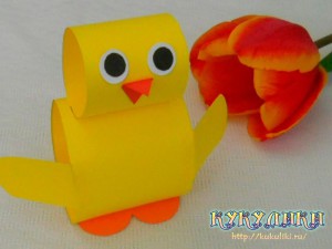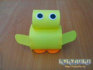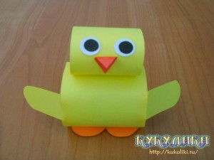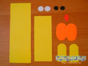 Вырезаем шаблоны и переносим их на цветную бумагу, соответствующих цветов: детали туловища, головы, крыльев (2 шт.) на желтую, клюв - на красную. Пуговичку большего размера обводим на бумагу белого цвета (2 шт.). Вторую пуговицу, меньшую по размеру, обводим на черную цветную бумагу (2 шт.). Это будут заготовки для глаз.