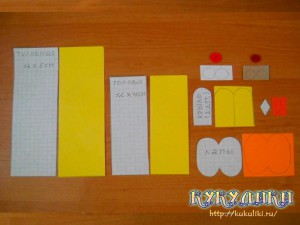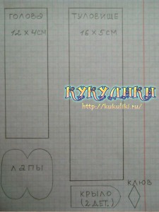 На листике бумаги в клеточку выполняем эскизы шаблонов: туловище (прямоугольник 16х5 см), голова (прямоугольник 12х4 см), лапы, клюв, крыло.