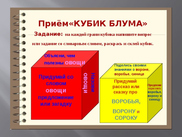 1. Понадобиться обычный бумажный куб, на гранях которого написано: Назови. Почему. Объясни. Предложи. Придумай. Поделись. 2. Формулируется тема урока. То есть тема должна обозначить круг вопросов, на которые придется отвечать. 3. Учитель бросает кубик. Выпавшая грань укажет: какого типа вопрос следует задать. Удобнее ориентироваться по слову на грани кубика — с него и должен начинаться вопрос.