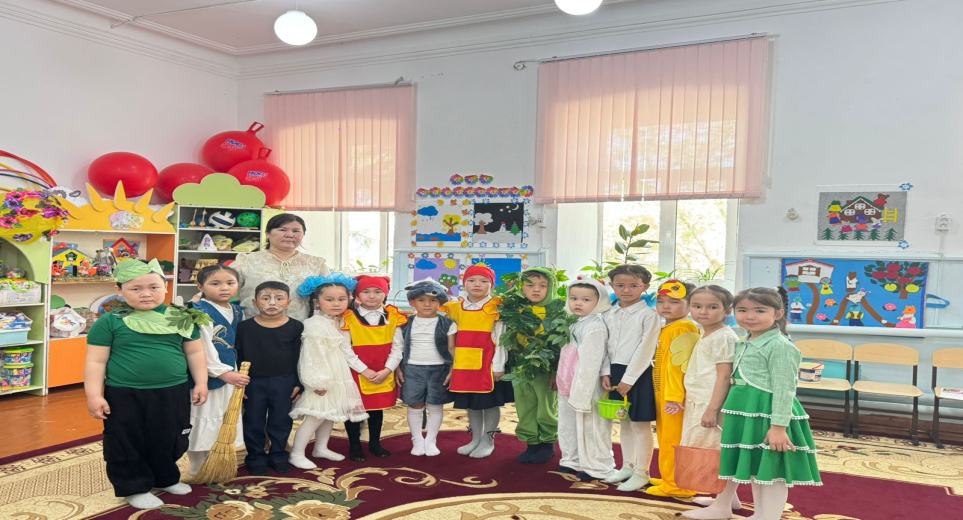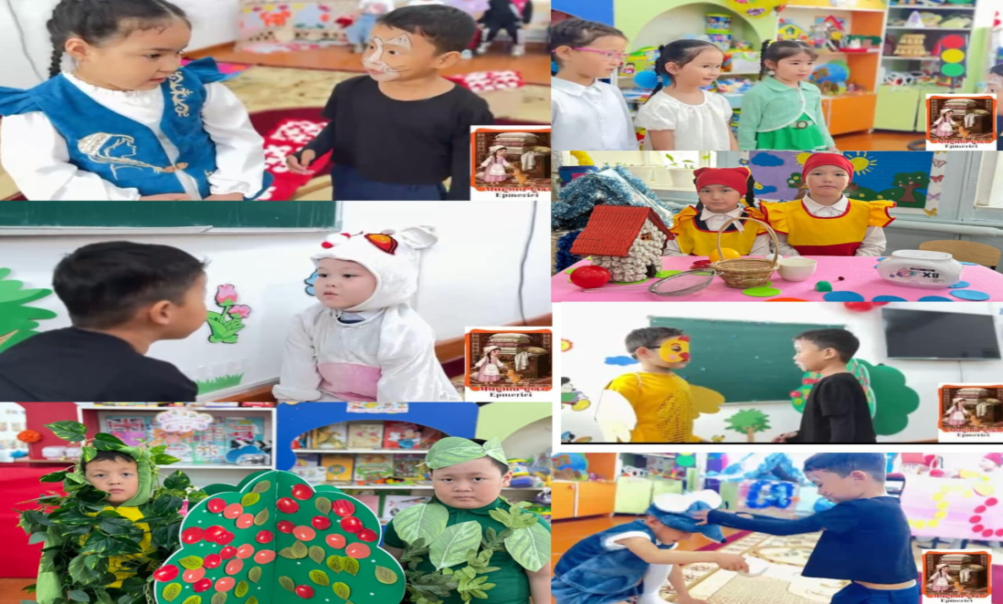 | Басы Ортасы Соңы. | Қажетті нәрселер: Ортада үстел үстінде ыдыстар, шелек, мақта қыз, мысық, сиыр, ағаш, дүкенші, тауық, тышқан киімдері. Ұйымдастыру кезеңі: Ал балалар, бүгін ерекше күн, себебі, біз «Ертегілер әлеміне» саяхатқа барамыз. Мұғалім: - (музыка ойналады «Ертегі әлемі»). Балалар көздерінді жұмып, ақырын айналамыз, балалар қараңдаршы қандай әдемі. Сендер қандай ертегілер білесіңдер. Шалқан,Қызыл телпек,тб Мұғалім: Ал, балалар сендер «Мақта қыз бен мысық» ертегісін білесіңдер ме? Балалар: Білеміз. Мұғалім: Ендеше ертегі кейіпкерлерінің рөлінде өзіміз ойнап, сахналаймыз. Бұл ертегі Ыбырай Алтынсариннің «Мақта қыз бен мысық» ертегісі. Ертегіні айтып беретін бізге Альбина . Ерте, ерте, ертеде, Ешкі құйрығы келтеде, Мақта қыз бен мысық өмір сүріпті. Мақта қыз үстел үстін реттейді. Ыдыстарды жиыстырған кезде мейіз тауып алады. Мақта қыз: - Мияуым менің, қайдасың? - Тарғылым менің, келе ғой, мен саған мейіз беремін (мысық келмейді) - Келмесең, келмей –ақ қой, өз обалың өзіңе,- деп (мейізді қыз жеп қояды) Мұғалім: Осы кезде үй артынан «мяу» деген дыбыс шығады. Мақта қыз ыңылдап ән салады, мысық шығады. Мақта қыз: Мысығым-ау, мысығым, Тарғылы жақсы түсінің. Таңертең де, кеште де, Бетін жуған пысығым. Піш - піш десем, келе ғой, Айтқаныма көне ғой. Шақырғанда піш-піш деп, «Мяу! -деп дыбыс бере ғой. Мысық: Менің атым мысық, Екі көзім қысық. Тышқан аулап отырамын Сүт-көжемді ішіп –дейді Мақта қыз, сен мені неге шақырдың? Мақта қыз: -Айтпаймын! Мысық: -Ендеше, мен сенің қатығыңды төгемін. Мақта қыз: - Ой,ой. Сен не істедің? Сол үшін мен сенің құйрығыңды кесіп аламын! Альбина: (құйрығын кесіп алады) Мысық: Берші, құйрығымды! Мақта қыз: Бермеймін! Қатығымды қайтарып бер! Альбина: Сөйтіп, мысық сиырға келеді. Сиыр: Менің атым сиыр, Өрісім алыс қиыр. Етім үшін, сүтім үшін, Адамдар маған үйір - дейді. Мысық: Мяу, сиыр, сиыр, сен маған қатық берші! Сиыр: Сен маған жапырақ әкел, менің қарным ашып тұр. Альбинаа: Сөйтіп, мысық ағашқа барады. Ағаш: Мен жасыл ағашпын, Күтсеңдер гүл ашам, Жолыңа нұр шашам, Жапырағым азық, Бұтағым қазық. Саяма сағаларсың, Салқындап дем аларсың. Мысық: Ағаш, ағаш, маған жапырақ берші! Ағаш: Маған су әкеліп бер мен шөлдедім, мен саған жапырақ беремін. Альбина: Сөйтіп, мысық су іздеп келе жатса, алдынан су тасып жүрген қыздар шығады. Қыздар: Су - тіршілік негізі, Онсыз өмір сүрмейсің. Тазалықтың негізі, Су деп қана білгейсің. деп қыздар әндетіп жүреді. Мысық: Мяу, қыздар маған су беріңдерші. Қыздар: Сен бізге дүкеннен сағыз әкеліп бер, біз саған су береміз. Альбина: Сөйтіп, мысық дүкеншіге келеді. Мысық: Мяу, дүкенші, дүкенші маған сағыз берші. Дүкенші: Маған жұмыртқа әкеліп бер, мен саған сағыз беремін. Альбина: Мысық әбден шаршады жұмыртқа іздеп тауыққа барады. Тауық: Мен ақ тауықпын, Өзім қақсауықпын. Альбина: -деп тауық әндетеді. Мысық: Мяу, тауық, тауық маған жұмыртқа берші. Тауық: Сен менің балапандарыма дән әкеліп бер, біз ашпыз. Альбина: Мысық ойға батып, басын ұстап не істерін білмей отырып қалады. Осы кезде бір тышқан жүгіріп шығып, інді қаза бастайды. Тышқан: Мен тышқанмын, Өзім дән екпеймін. Егістен ұзап кетпеймін, Айналам толы ән, Қоймам толы дән, Дәнді тастап кетпеймін. Альбина: - деп ән салып жүрген тышқанды мысық бас салып ұстап алады. Мысық: Айт, үйіңде не бар? Жаныңның барында айт, тез, әйтпесе, қазір жеп қоямын. Тышқан: Сен маған бір ән айтып бер. Альбина: Тыш