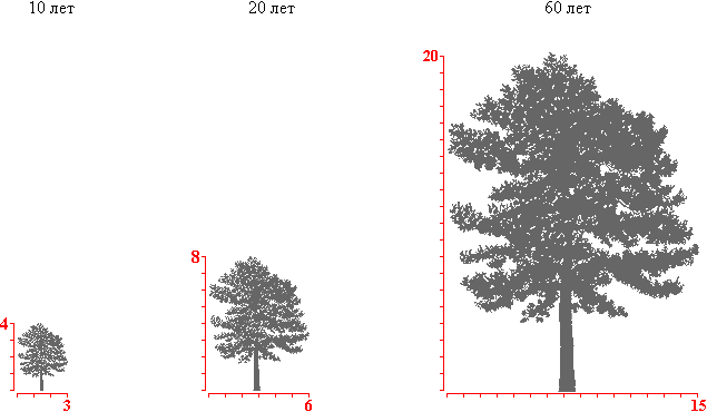 В дикой природе высота ствола увеличивается в среднем до 10 см ежегодно, на протяжении первых 5 лет. Далее темпы только ускоряются. Сосна обыкновенная в 5–10 лет прирастает уже на 30–40 см в год, а более старые деревья набирают до 1 м. Замедление роста происходит в 30–40 лет. В среднем, у взрослого дерева диаметр кроны в местах крепления нижних побегов достигает 4 м.