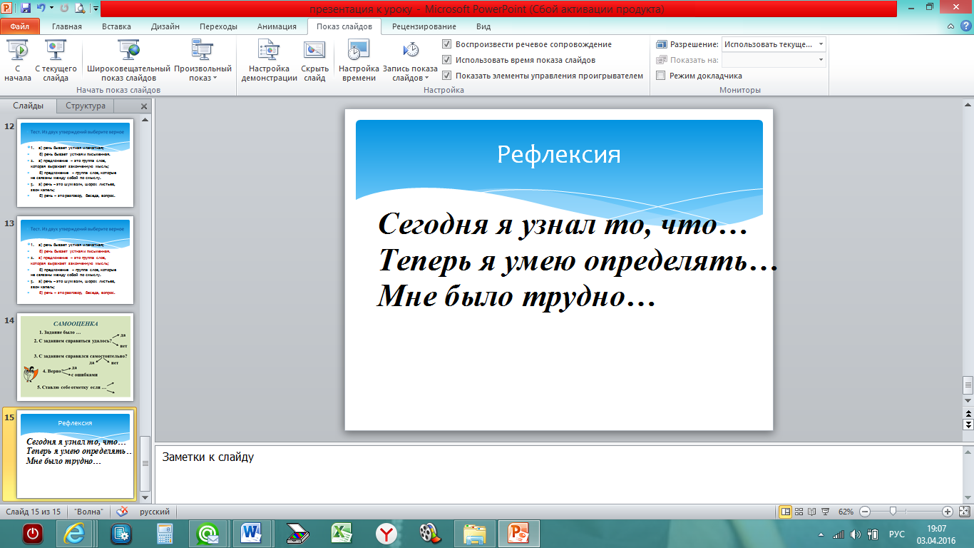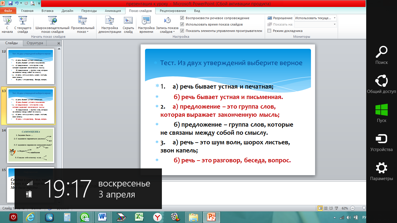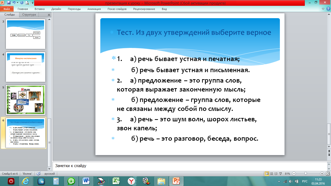 Практикум. | Организация деятельности учащихся по освоению учебной информации на уровне «умения». | Из двух утверждений выберите верное. 1. а) речь бывает устная и печатная; б) речь бывает устная и письменная. 2. а) предложение – это группа слов, которая выражает законченную мысль; б) предложение – группа слов, которые не связаны между собой по смыслу. 3. а) речь – это шум волн, шорох листьев, звон капель; б) речь – это разговор, беседа, вопрос. | Выполняют тест на нетбуках, выбирая правильный ответ на время | |