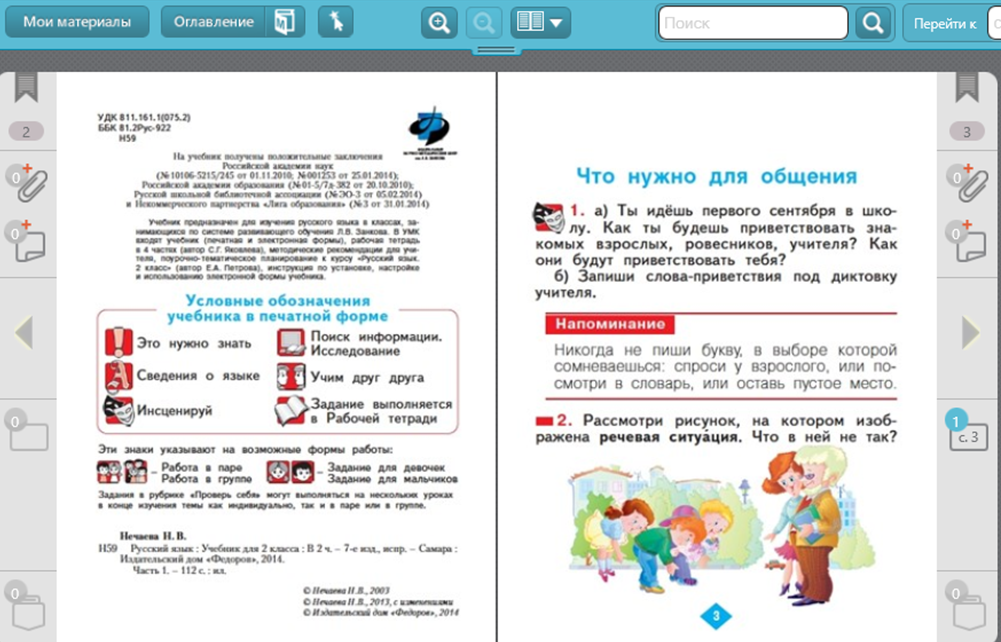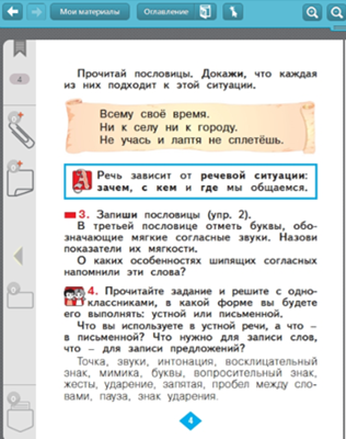 Организация и самоорганизация учащихся в ходе усвоения материала. Организация обратной связи. | Организация деятельности учащихся по освоению учебной информации на уровне «знание». | - Прочитайте название главы в учебнике. «Что нужно для общения» - Как бы вы ответили на этот вопрос? Упр. 1 Инсценирование - Как вы будете приветствовать знакомых взрослых, ровесников, учителя? Как они будут приветствовать вас? - Запишите под диктовку: Здравствуйте, добрый день, привет, доброе утро, добрый вечер. - Какое напоминание в учебнике предлагает автор? ФИЗМИНУТКА : Здравствуй, пальчик – дедушка, Здравствуй, пальчик – бабушка, Здравствуй, пальчик – папа, Здравствуй, пальчик – мама, Здравствуй, пальчик – Я. Здравствуй, вся моя семья! Упр.2 Работа по рисунку. с.3 - Что такое речевая ситуация? - Что вы можете рассказать по рисунку? На рисунке современные дети по старорусскому обычаю кланяются в пояс, приветствуя взрослых. - Какие средства устной речи используют люди? (звуки речи, слова, голос, мимика, движения) - А средства письменной речи? (буквы, слова) - Все ли правильно в этой речевой ситуации? - Прочитайте пословицы с.4 Докажите, что каждая подходит к данной речевой ситуации - Из каких компонентов (частей) состоит речевая ситуация? - Прочитайте сведения о языке с. 4 Речь зависит от речевой ситуации: зачем, с кем и где мы общаемся. - Что это значит? - Можем ли мы назвать теперь компоненты речевой ситуации? Физминутка. | Осваивают структуру и особенности оформления учебника Выполняют задание Ответы детей Инсценируют приветствия Самостоятельная работа Читают про себя, объясняют Ответы детей Выполняют физминутку для пальчиков Рассматривают рисунок, анализируют речевую ситуацию Ответы детей Работа в группах Соотносят пословицы и речевую ситуацию Самостоятельно читают, объясняют прочитанное Обобщают пройденное | |