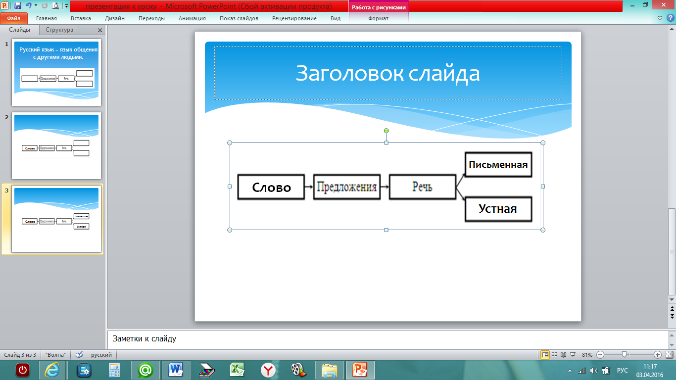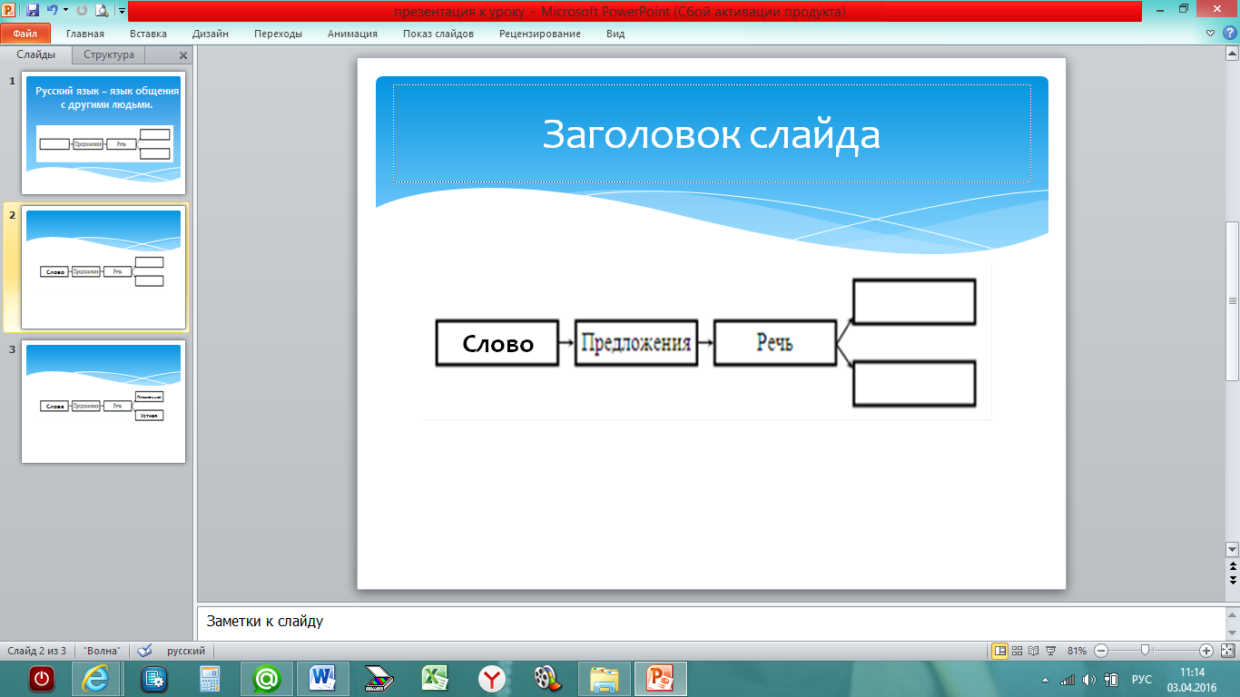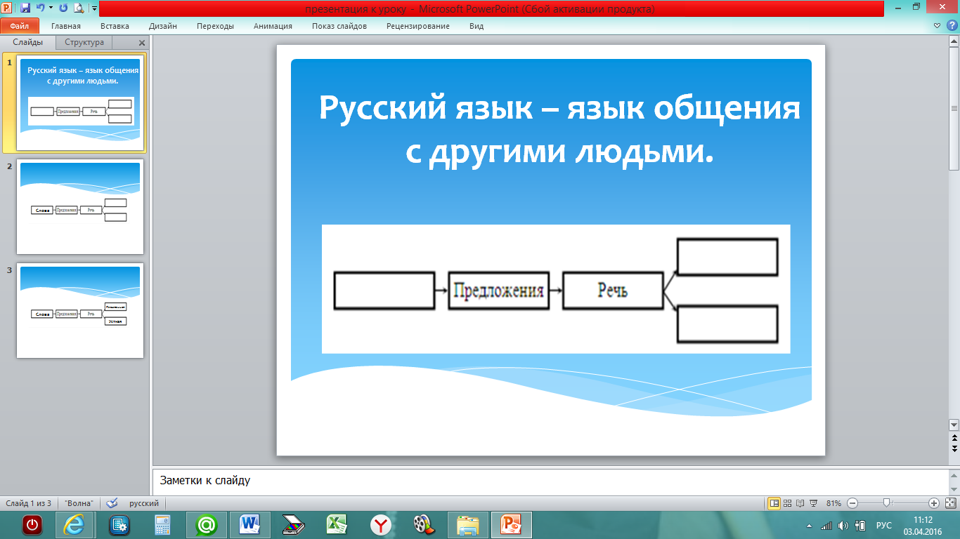 Вхождение в тему урока и создание условий для осознанного восприятия нового материала | Повторение и актуализация опорных знаний. Мотивация учебной деятельности. | На доске записано предложение и схема: Русский язык – язык общения с другими людьми. – Что записано на доске? Почему вы решили, что это предложение? – Из чего состоит предложение? (В схему вставляется карточка с записью «Слово».) Слитно или раздельно пишутся слова в предложениях? – Приведите примеры способов общения людей (беседа, письмо). Какой бывает речь? (в схему добавляются карточки с записью «письменная», «устная».) – Чем устная речь отличается от письменной? – Спишите предложение. С маленькой или большой буквы пишется первое слово в предложении? Какое словарное слово встретилось в этом предложении? (Русский язык.) - Проверьте друг у друга, оцените работу. - Что можно рассказать по этой схеме? - Что такое речь? - Для чего она нужна? - На какие 2 группы можно разбить нашу речь? - Чем отличаются буквы от звуков? http://fs00.infourok.ru/images/doc/258/263110/640/img4.jpg | Работа в парах Обсуждают вопрос, дополняют схему Ответы детей Выполняют задание с последующей взаимопроверкой Взаимооценка Ответы детей Работают по заданиям на слайде Выполняют задание по чистописанию Вспоминают значения слова ЯЗЫК | |