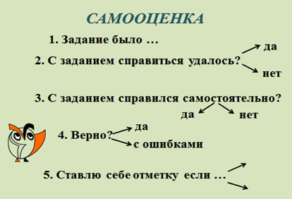 Подведение итогов. Домашнее задание. | Проведение самоанализа и самооценки собственной деятельности. Обеспечить понимание учащимися цели, содержания и способов выполнения домашнего задания. | – Ребята, давайте вспомним, что мы делали сегодня на уроке? – Какую учебную задачу мы ставили в начале урока? - Что нам помогло справиться с этой задачей? - Какой вид информации мы использовали на уроке? – Что нового узнали? – Что было самым интересным на уроке? - Оцените свою работу на уроке, продолжив предложения: Сегодня я узнал то, что… Теперь я умею определять… Мне было трудно… Домашнее задание. Упр. 3, с.4 | Рефлексия своей работы. Ответы детей Самооценивание. Дети проговаривают вслух окончания предложений. Записывают домашнее задание | |