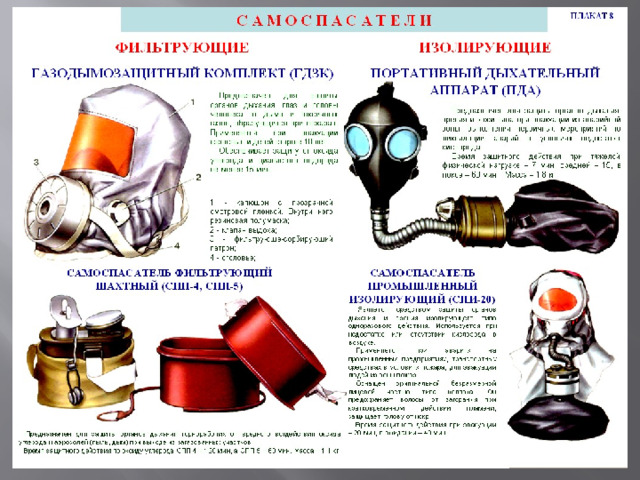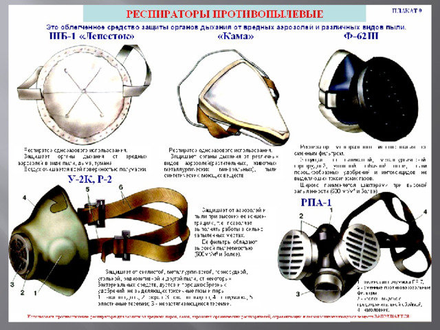 а) органов дыхания ( ватно-марлевая повязка, респираторы, респираторы противогазовые, самоспасатели, противогазы фильтрующие и изолирующие)