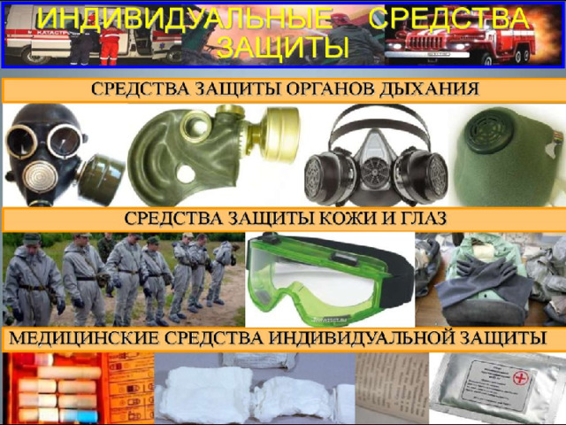 Индивидуальные средства защиты населения от чрезвычайных ситуаций (ЧС) — это предметы или группы предметов, предназначенные для защиты одного человека от радиоактивных, опасных химических и биологических веществ, а также светового излучения ядерного взрыва.