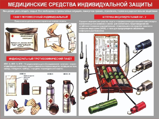 Аптечка индивидуальная АИ–2 . Содержит медицинские средства защиты и предназначена для оказания самопомощи и взаимопомощи при ранениях и ожогах, предупреждения или ослабления поражения радиоактивными, отравляющими или аварийно химически опасными веществами.
