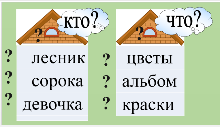 2.Открытие детьми нового знания 3.Первичное закрепление 4.Физминутка | УУРД: составление плана действий; принимать себя не осуждая. УУПД: Работать по предложенному плану, выдвигать свой план. УУКД: Воспринимать и формулировать цели и задачи. Умение соотносить свои действия с планируемыми результатами. Уметь работать индивидуально | Знайка и Незнайка 1.Предметы 2 Эти слова обозначают живые и неживые предметы. Кто? Что? Дети задают вопросы. Слова, отвечающие на вопросы кто? что? Дети читают. Будем учиться задавать вопросы к словам Письменное выполнение задания в тетради Выделяют лишние слова, объясняет по какому принципу определили Дети распределяют по домикам слова, задавая вопрос к слову. 1 домик – одуш.предметы 2 домик – неодуш.предметы Работа фронтальная Работа в тетрадях Дети записывают в тетрадь слова Дети слушают учителя и выполняют. Работа в парах | Проводит подводящий диалог к постановке темы урока. - К нам пришли гости. - Кто пришёл? -Знайка расселил слова в два домика, спросил у Незнайки, по какому признаку он их расселил. А он не может ответить на этот вопрос. - Давайте прочитаем их и поможем ему. По какому признаку Знайка расселил их в два домика? - Что обозначают эти слова? - Посмотрите на 1 домик. Прочитаем слова. - Какой вопрос можно задать к каждому слову? Посмотрите на 2 домик. - Какой вопрос можно задать к каждому слову? Назовём тему урока. Чему будем учиться? Прочитаем хором: Слова отвечающие на вопрос кто? Слова отвечающие на вопрос что? С. 23 упр. 11 Проверьте себя. Оцените свою работу!!! 1в. Первая строчка 2в. Вторая строчка Учитель, музыкант, шофёр Чайка, скворец, сорока Оцените свою работу. На доске 2 домика . Разбросанные слова. КОРОВА, СНЕГИРЬ, КОШКА. ЛИСТ, КРУЖКА, ПОЛКА. Какие слова поселились в 1 домике? Какие слова поселились во 2 домике? Запишем слова в тетрадку. Так же как на доске. Справились с работой. Оцените свою работу!!! Кто научился задавать вопросы? Кому было трудно? Кому было трудно вызываю к доске. Дети берут карточку читают слово. Задают вопросы. Давайте сделаем вывод: -Какие слова отвечают на вопрос кто? - Какие на вопрос что? ФИЗМИНУТКА - Если вы услышите предмет, название которого отвечает на вопрос кто? – хлопаете в ладоши, если предмет, название которого отвечает на вопрос что? – топайте Книга, лошадь, дверь, голос, ласточка, тетрадь, шмель, щука, окно, актёр, зайчик солнечный и зайчик живой Работа в парах с самопроверкой по эталону - Сейчас вы будете работать в парах, не забывайте быть вежливыми друг к другу, уважайте мнение своего соседа. Кто? раскрась что? берёза кузнечик дом ворона пчела пальто книга Оцените свою работу!!! | Слайд 2 Слайд 3 Слайд 4 Слайд 5 Слайд 6 Дети распределяют слова, задавая вопрос, затем записывают слова в тетрадь Карточки Приложение 1 Приложение 2 |