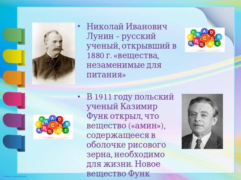 Николай Иванович Лунин – русский ученый, открывший в 1880 г. «вещества, незаменимые для питания» В 1911 году польский ученый Казимир Функ открыл, что вещество («амин»), содержащееся в оболочке рисового зерна, необходимо для жизни. Новое вещество Функ назвал «витамин»